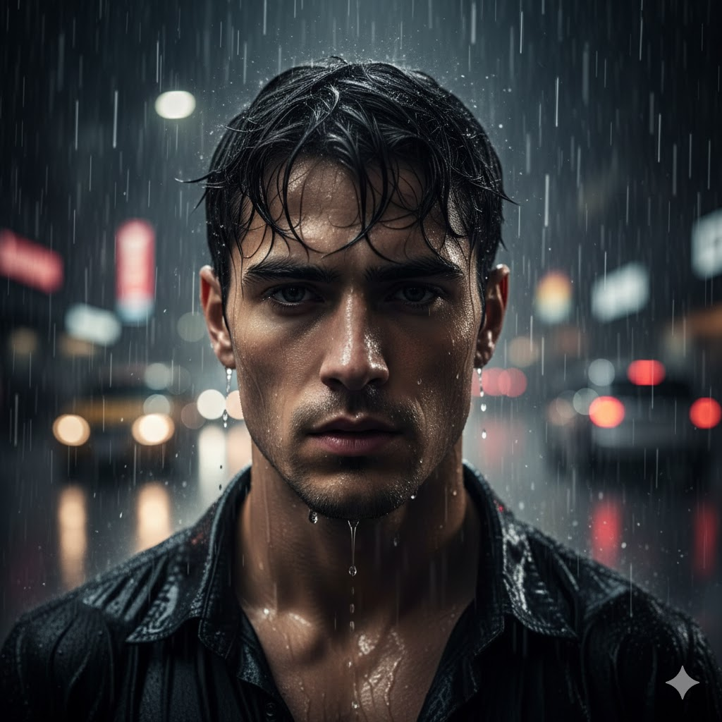 A dramatic portrait of a young man standing in rain, wet hair, water droplets on face, serious expression, dark cinematic lighting, ultra realistic texture, moody atmosphere, shallow depth of field, 4K HDR, cinematic photography
