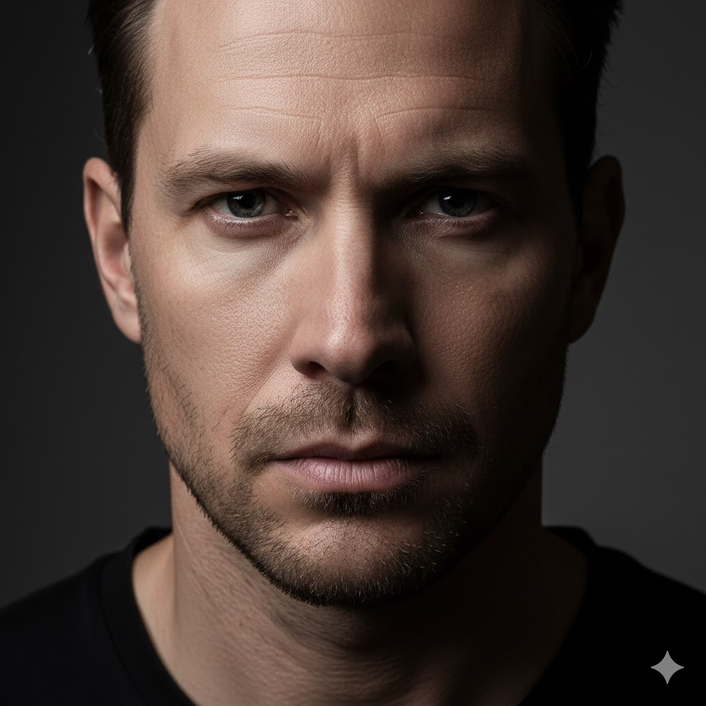 A close-up portrait of a confident man, sharp eyes, strong jawline, minimal background, studio lighting, ultra realistic skin texture, high detail, DSLR photography, cinematic shadows, professional photoshoot, 8K resolution