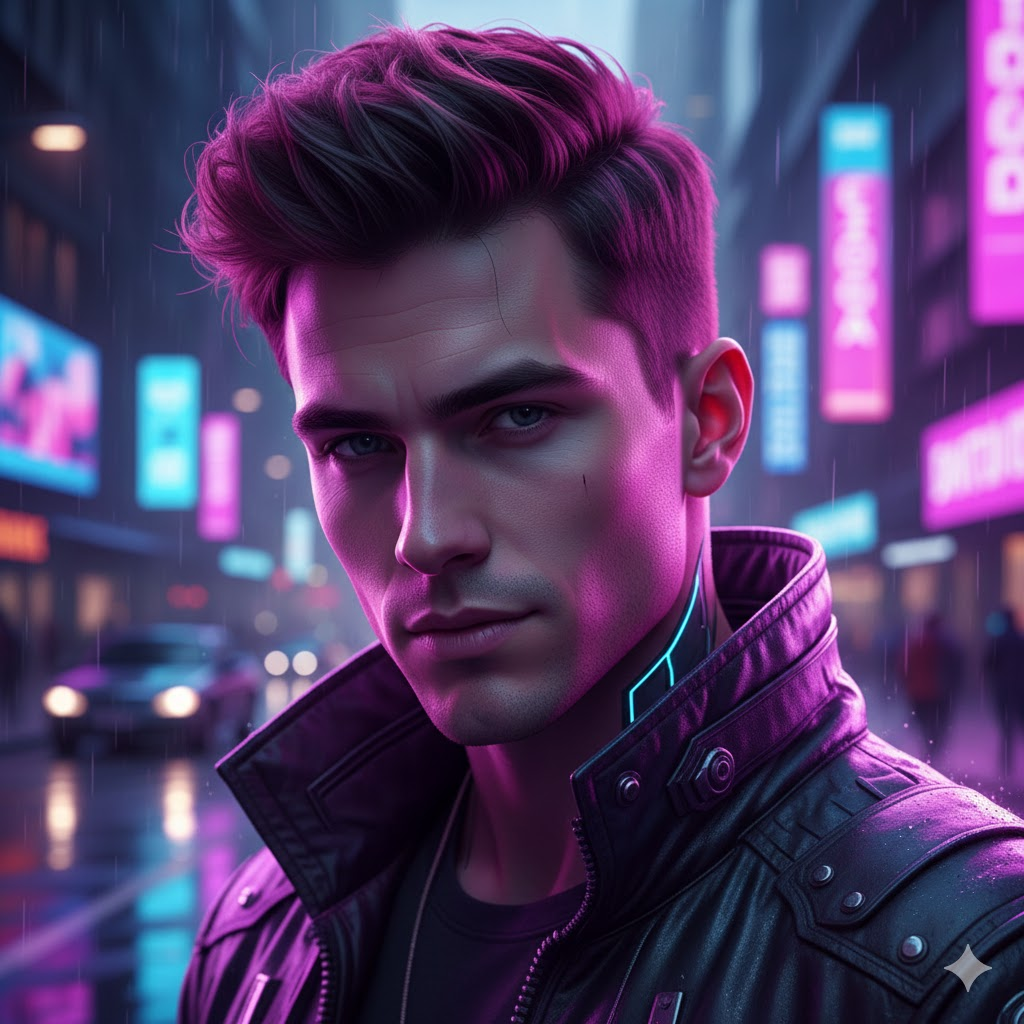 A stylish young man under neon lights, purple and blue glow, futuristic vibe, confident expression, ultra realistic face, cinematic lighting, sharp details, cyberpunk style, high resolution, influencer aesthetic