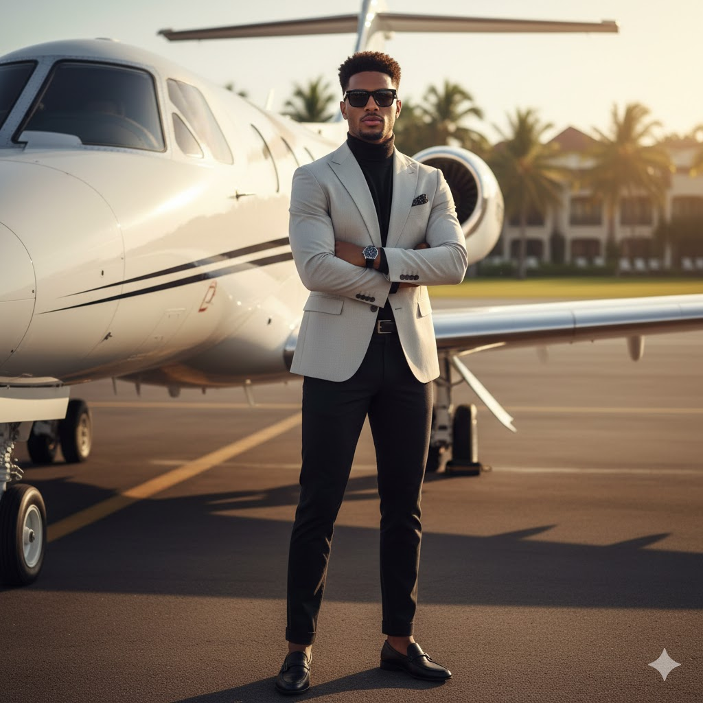 A rich young man standing near a private jet, wearing luxury outfit, sunglasses, confident pose, golden hour lighting, ultra realistic face, cinematic composition, premium lifestyle, high detail, 8K resolution, influencer style