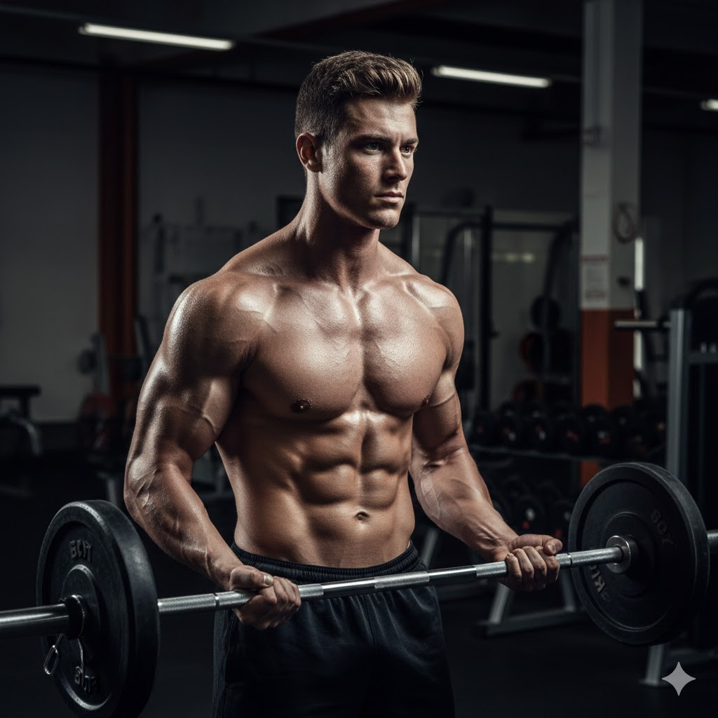 A muscular young man in gym, intense expression, sweat details, strong physique, dramatic lighting, ultra realistic skin texture, cinematic shadows, high contrast, fitness photoshoot style, DSLR quality, 4K resolution, powerful attitude
