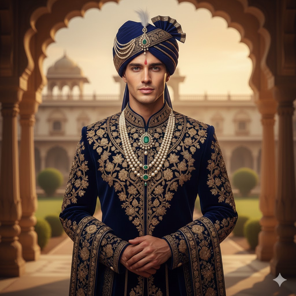 A royal young man wearing traditional sherwani, heavy embroidery, palace background, soft golden lighting, ultra realistic face, rich colors, cultural elegance, cinematic look, DSLR photography, high detail, 8K resolution, king attitude