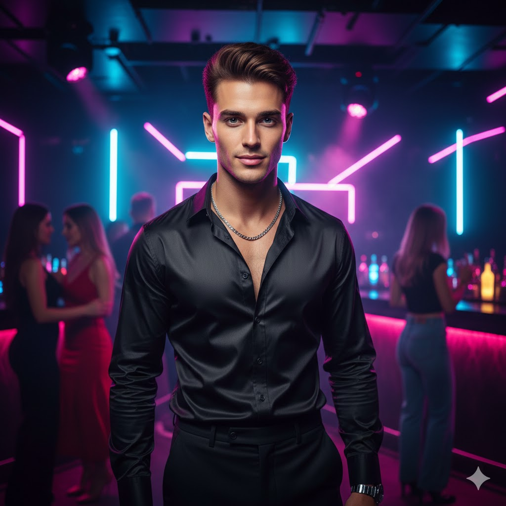 A handsome young man in a luxury nightclub, stylish outfit, neon lights, party vibe, confident attitude, cinematic lighting, ultra realistic face, sharp focus, high detail, 8K resolution, influencer lifestyle, rich atmosphere
