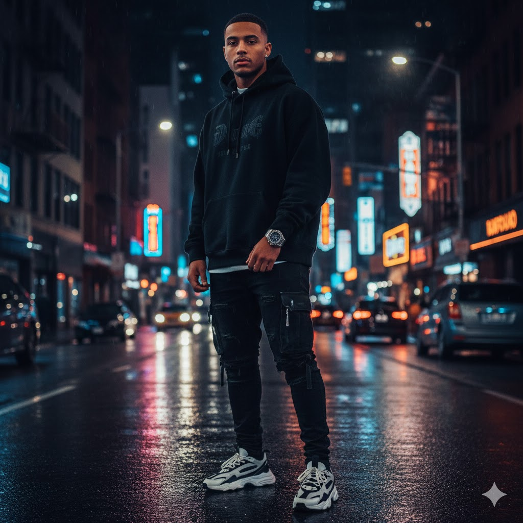 A young stylish man standing on city street, wearing streetwear fashion, hoodie and sneakers, luxury watch, urban background, cinematic lighting, ultra realistic skin texture, moody tones, DSLR photography, high contrast, depth of field, Instagram influencer style