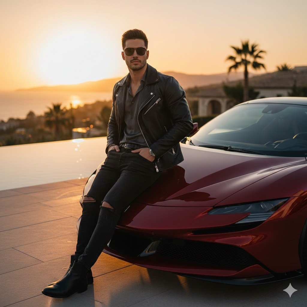 A confident young man leaning on a luxury sports car, wearing black sunglasses and stylish outfit, golden hour lighting, premium lifestyle, rich background, ultra realistic skin texture, cinematic shadows, DSLR photography, 85mm lens, shallow depth of field, high contrast, 8K resolution, attitude pose, influencer style