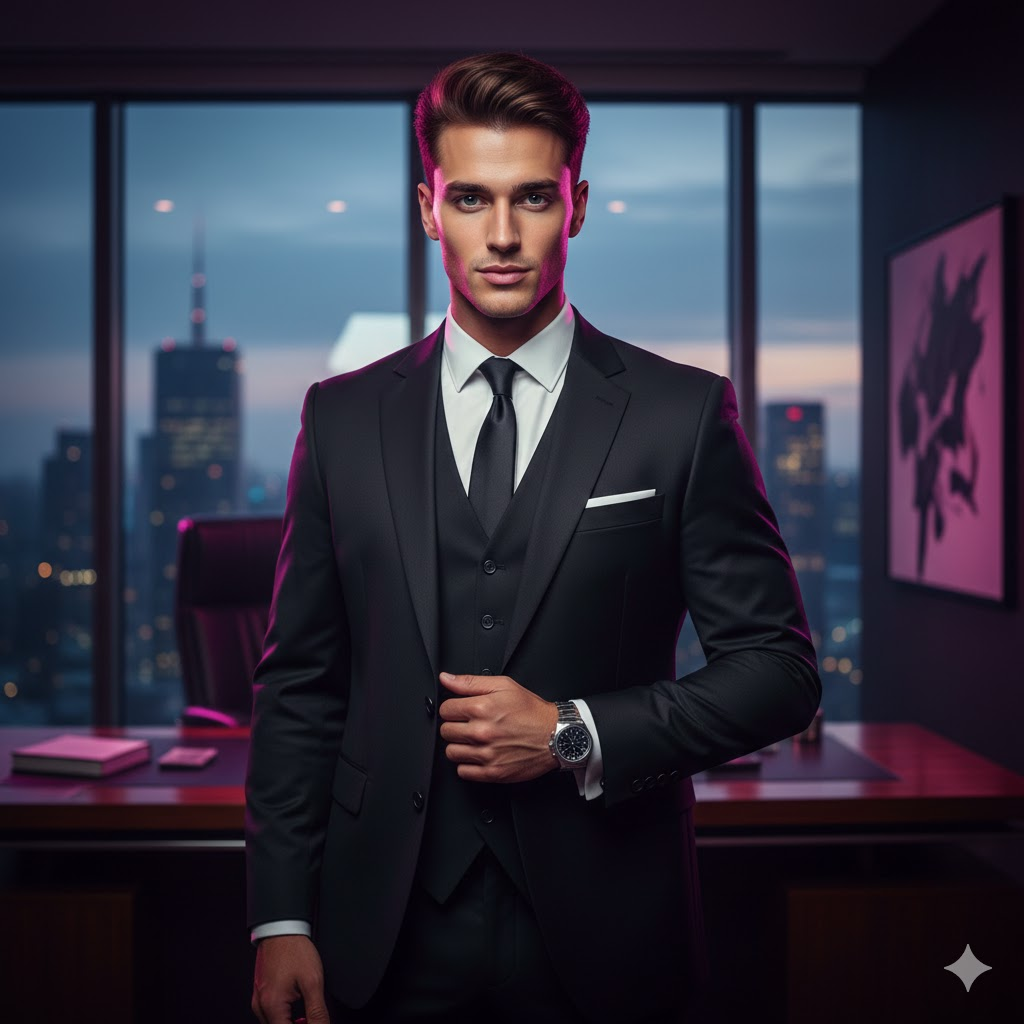 A stylish businessman wearing a black suit, standing in a luxury office, confident expression, expensive watch, cinematic lighting, ultra realistic face, sharp jawline, DSLR quality, high detail, professional photoshoot, depth of field, premium look, 4K resolution