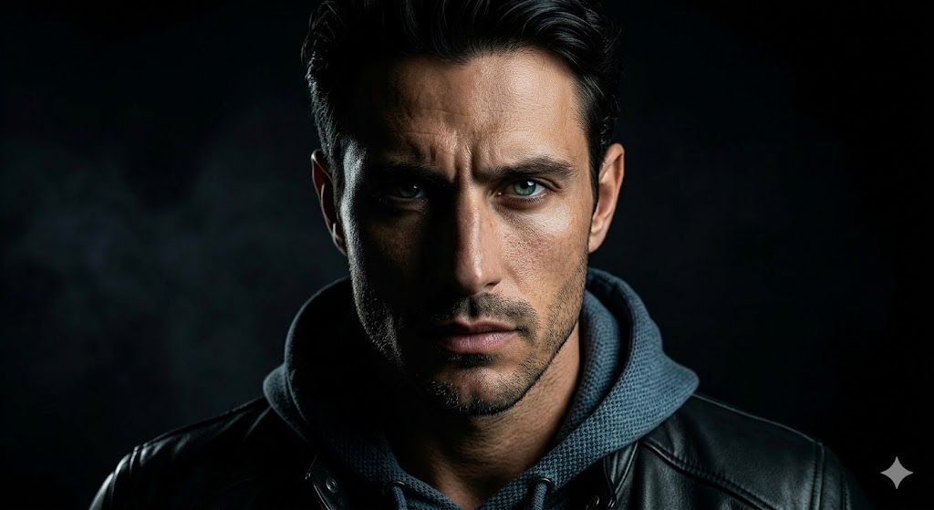 A mysterious portrait of a man with face partially in shadow, dark background, dramatic lighting, intense expression, ultra realistic skin texture, cinematic style, high contrast, DSLR photography, 4K HDR