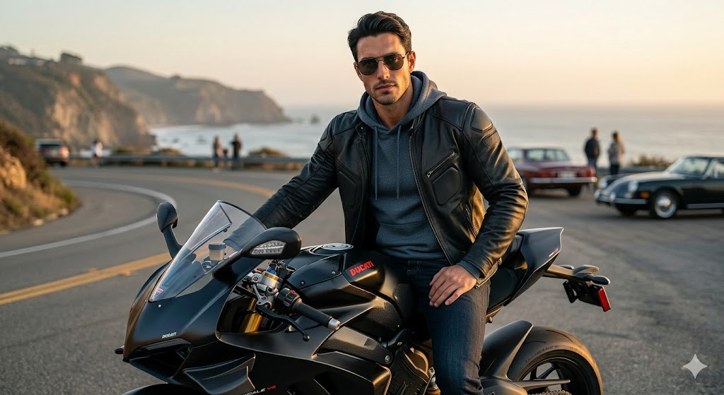 A young man sitting on a sports bike, stylish outfit, sunglasses, outdoor background, cinematic lighting, ultra realistic face, confident pose, DSLR photography, high detail, 8K resolution