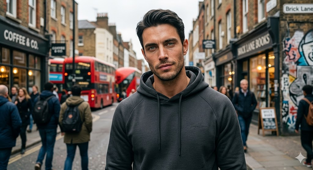 A stylish young man wearing a hoodie, cool expression, casual street background, soft lighting, ultra realistic skin texture, cinematic composition, DSLR photography, Instagram influencer style, 4K resolution