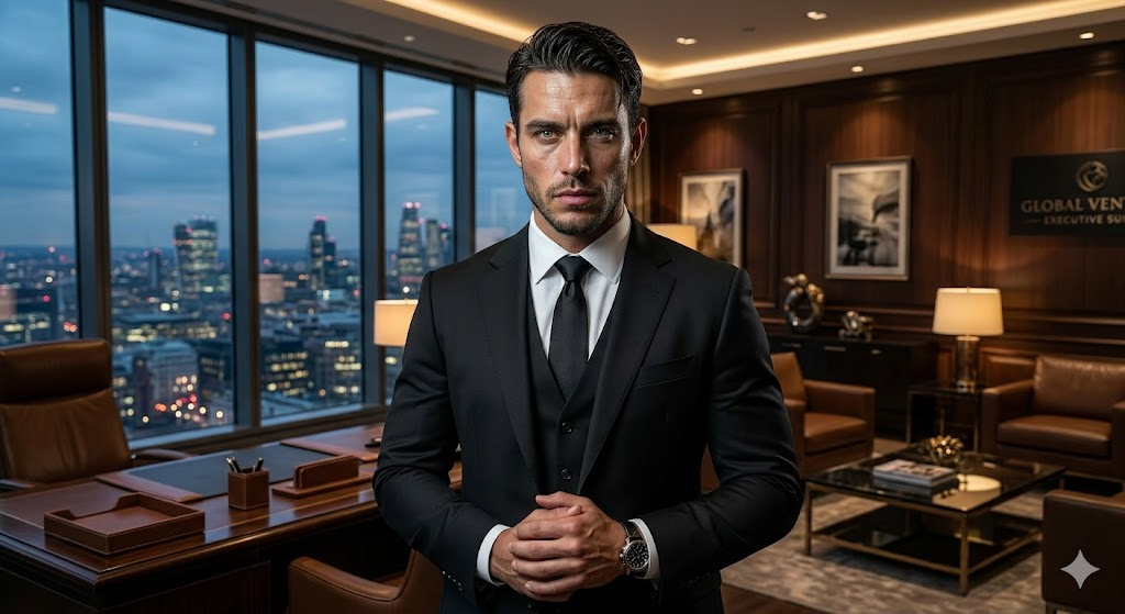A confident businessman wearing a black suit, standing in a luxury office, serious expression, cinematic lighting, ultra realistic face, sharp focus, professional photoshoot, high detail, 8K resolution
