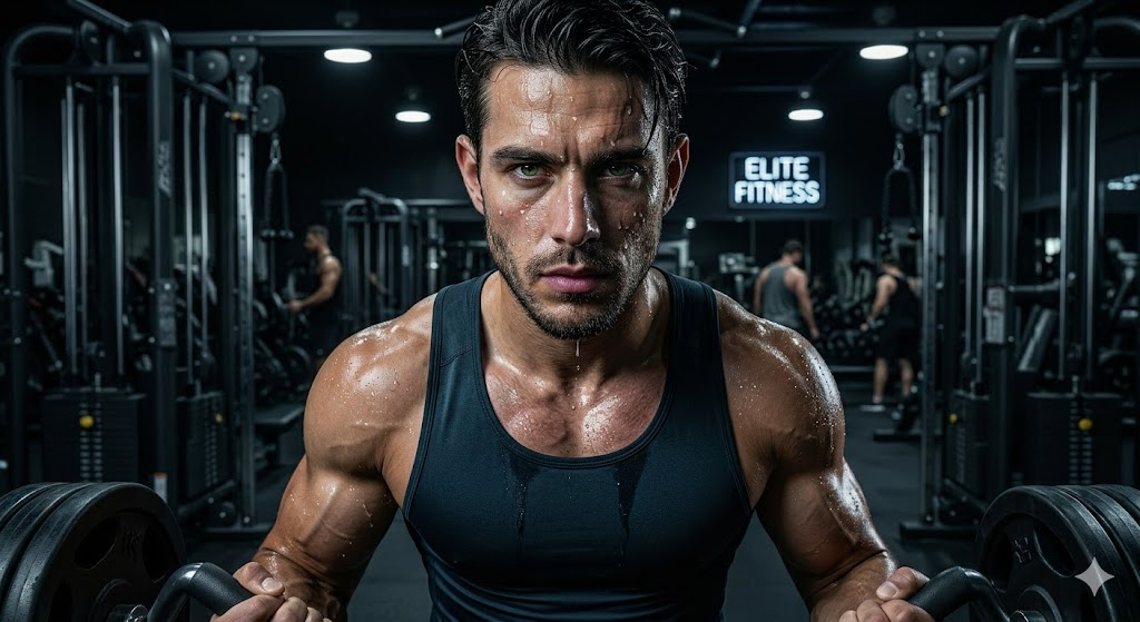A muscular young man in gym, intense expression, sweat details, strong physique, dramatic lighting, ultra realistic skin texture, cinematic shadows, high contrast, fitness photoshoot style, DSLR quality, 4K resolution