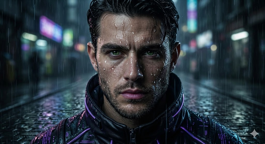 A dramatic portrait of a young man standing in rain, wet hair, water droplets on face, serious expression, dark cinematic lighting, ultra realistic texture, moody atmosphere, shallow depth of field, 4K HDR