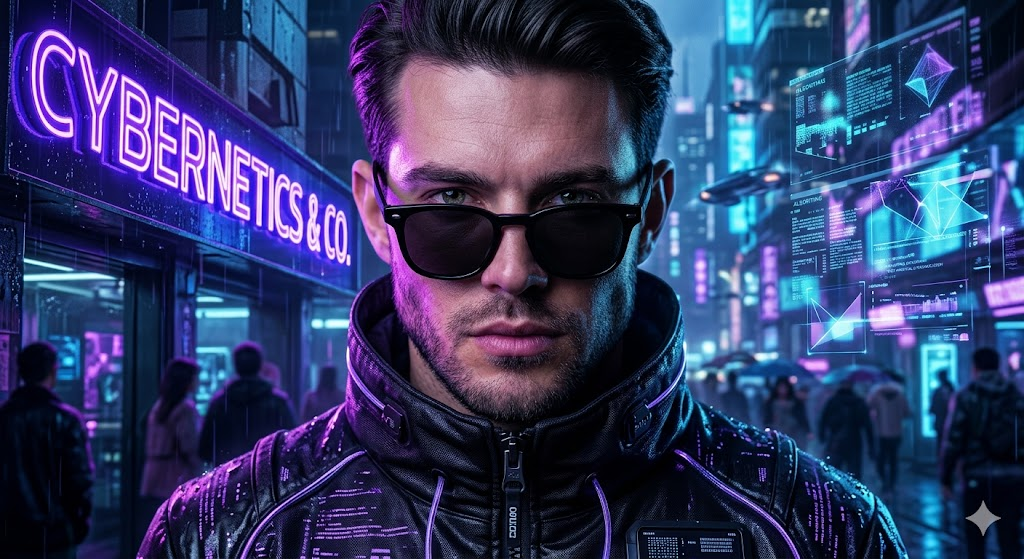 A stylish young man under neon lights, purple and blue glow, futuristic vibe, confident expression, ultra realistic face, cinematic lighting, sharp details, cyberpunk style, high resolution, influencer aesthetic
