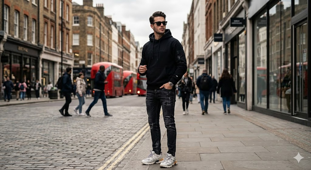 A fashionable young man standing on a city street, wearing hoodie and sneakers, urban background, natural lighting, candid pose, ultra realistic skin texture, cinematic look, DSLR photography, high contrast, Instagram style, 4K resolution