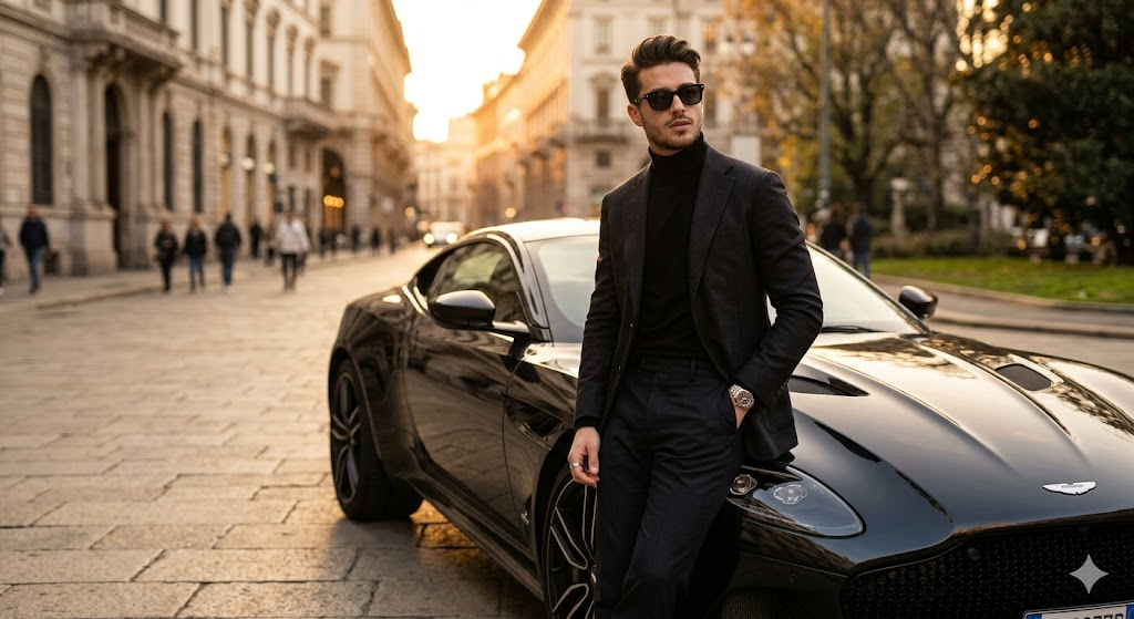 A stylish young man wearing a luxury outfit and sunglasses, standing near a luxury car, confident pose, golden hour lighting, premium lifestyle, ultra realistic skin texture, cinematic shadows, DSLR photography, 85mm lens, shallow depth of field, high detail, 8K resolution, influencer style