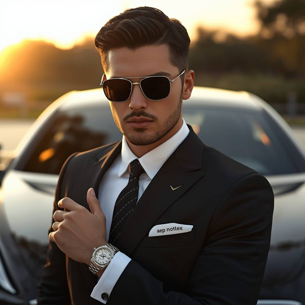 A stylish rich young man wearing a black suit and sunglasses, luxury lifestyle portrait, golden hour sunlight, expensive background, luxury car behind, high fashion photography, ultra realistic skin texture, 8K resolution, cinematic shadows, premium look, Rolex watch, sharp details, Instagram influencer style, photorealistic