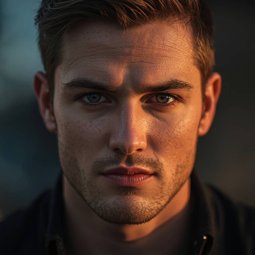 A stunning ultra realistic portrait of a young confident man, cinematic lighting, sharp jawline, detailed skin texture, natural skin pores, DSLR quality, 85mm lens, shallow depth of field, golden hour lighting, soft shadows, realistic eyes, ultra HD 4K resolution, bokeh background, professional photography style, dramatic mood, high contrast, masterpiece, trending on artstation